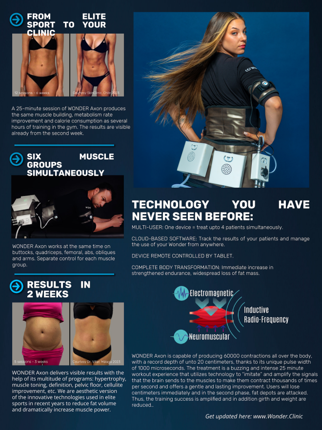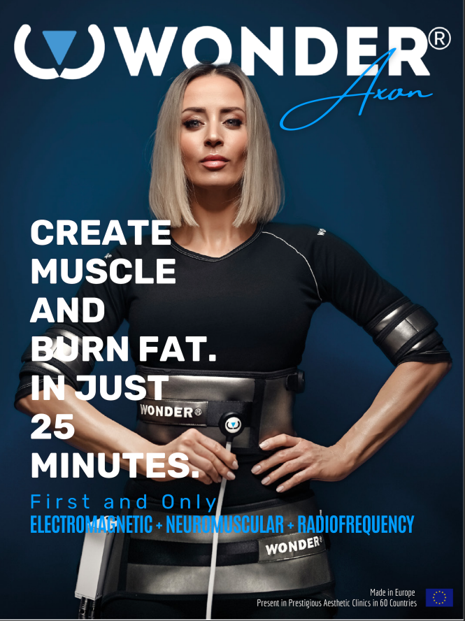 Experience our luxurious body treatment, powered by the remarkable Wonder Axon technology. This technology integrates focused electromagnetic therapy, intense neuromuscular emissions, and modern inductive radio frequency to raise dermal and adipose tissue temperature by up to 45 degrees.